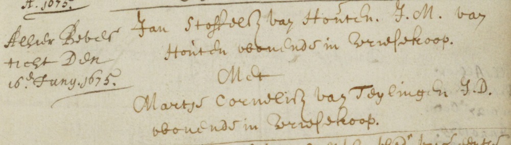 1675 - Trouwen Jan Stoffelsz van Houten (uit Houten) en Martje Cornelis van Teijlingen