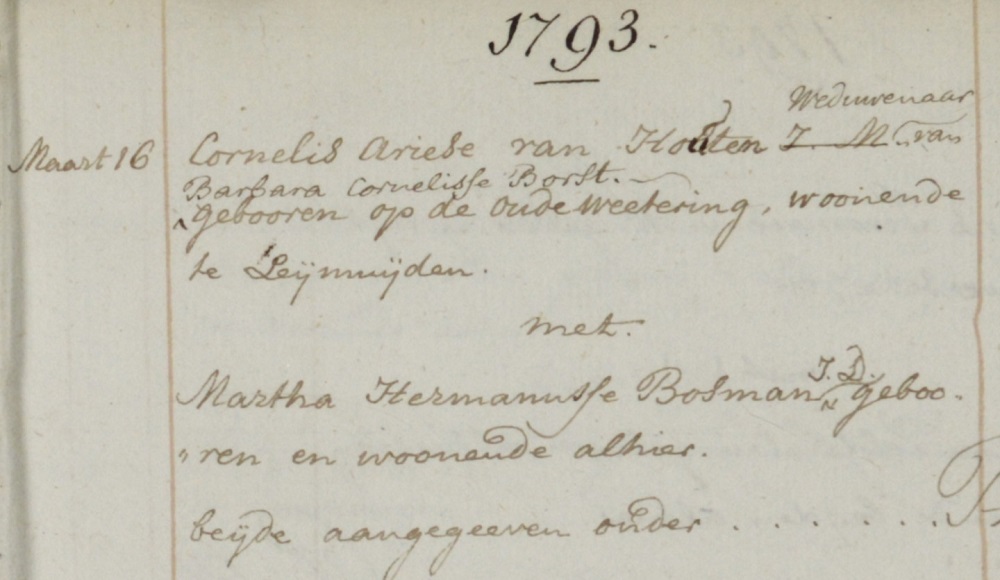 Getrouwd 2e huwelijk 18-03-1793 Rijnsaterwoude met Martha Hermanusse Bosman
